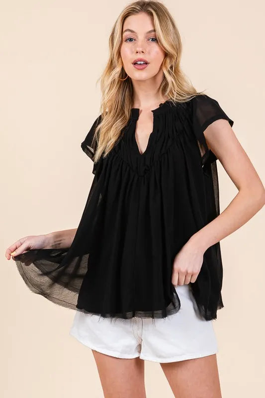 The Sensoria Solid Shirred Flutter Sleeve Chiffon Blouse