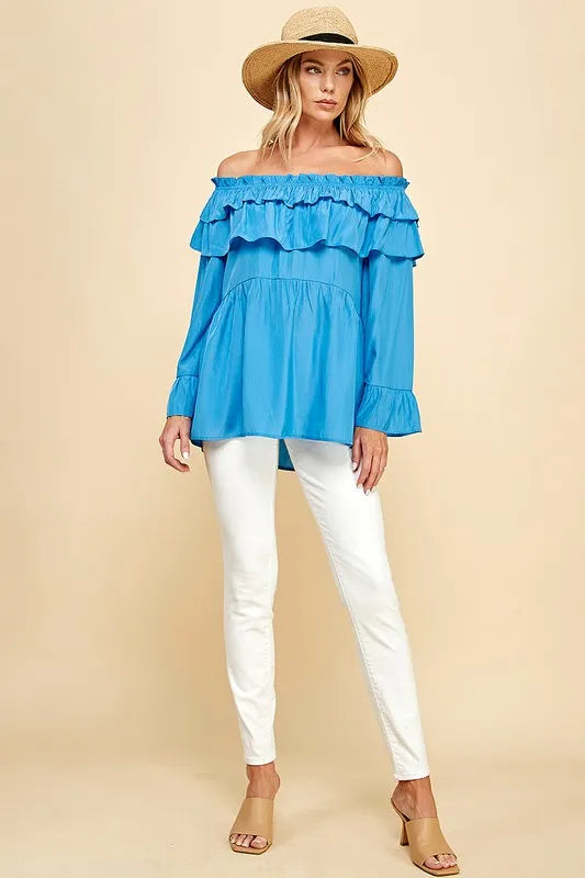 Veridian Opulence Ruffled Trumpet Sleeve Off-The-Shoulder Top