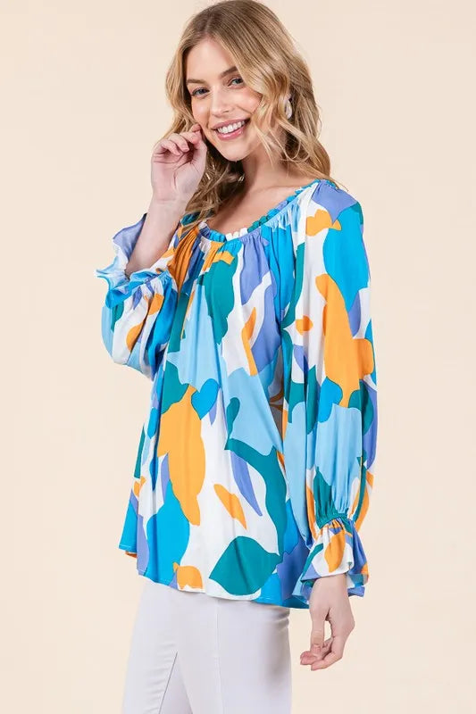 Solstice Luxe Abstract Print Off-the-shoulder Long Sleeve Top