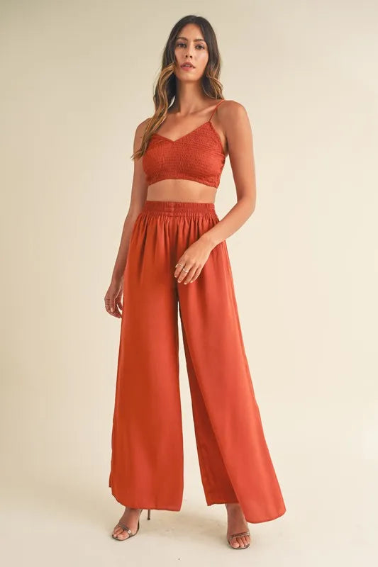 Woven Legacy Smocked Bralette Crop Top and Wide Leg Pants Set