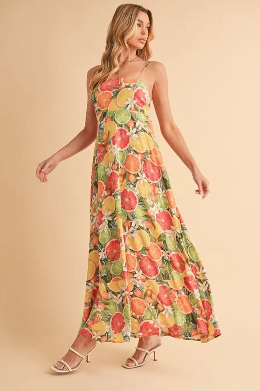 Aurora Sweep Fruit Print Square Neck Maxi Cami Dress