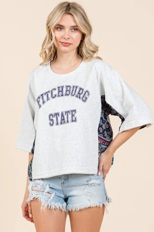The Rare Find Fitchburg State Graphic Contrast Half Sleeve Top